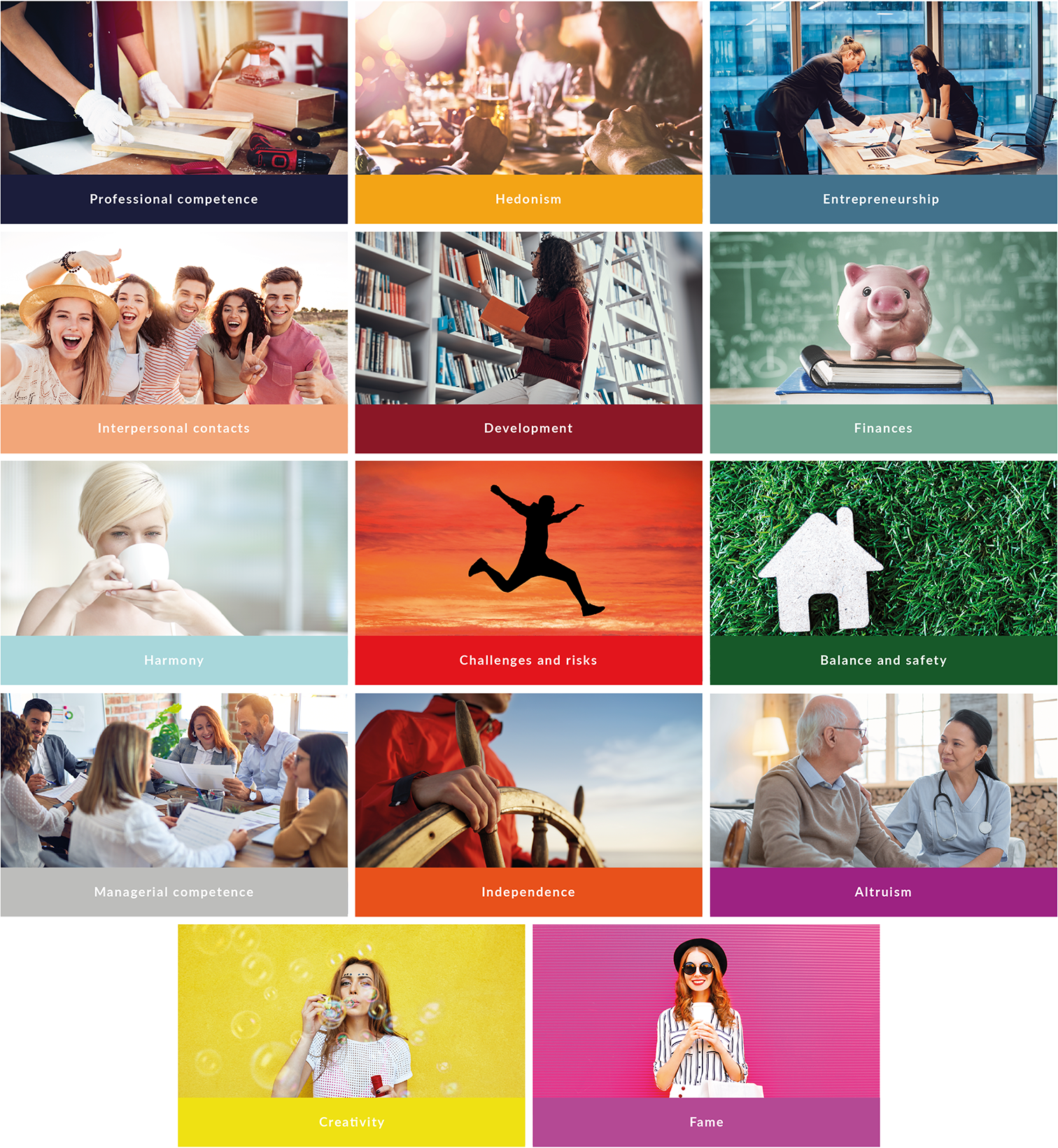 It defines 14 areas that display the values of an individual in professional life, incorporated within three components: perceived talents and abilities (areas of competence), basic values and developed motivators and needs.