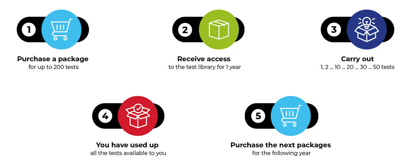 After completing the training course and receiving a certificate, the participant of each certified PROFI COMPETENCE TRAINING training course will gain access to the SPECIAL OFFER as part of the PROFI COMPETENCE LICENSE. The completion of each available training course provides the right to purchase DEDICATED LICENCES at special PRICES. Each license grants access to a TEST LIBRARY of specific tests for a 1-year period.
