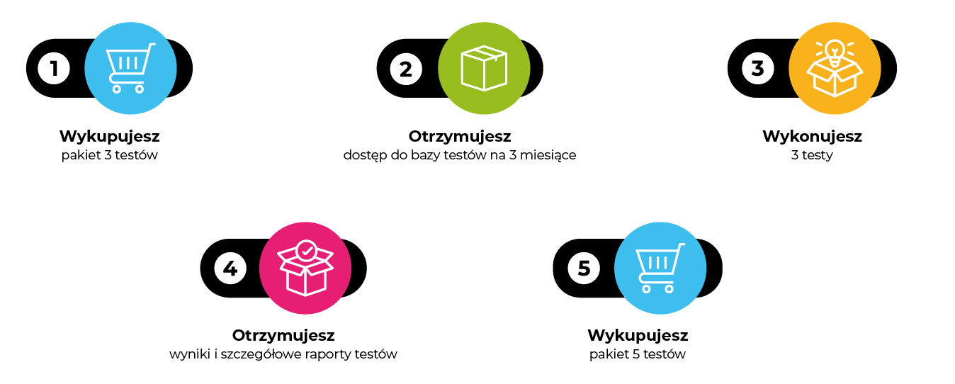 Możesz kupić jeden test z dostępnych produktów lub pakiet 2, 3 lub 5 testów z wynikami i szczegółowymi raportami. W zależności od rodzaju wykupionego pakietu otrzymujesz dostęp do bazy wszystkich produktów i wybierasz testy, które chcesz wykonać (2, 3 lub 5 testów w zależności od wykupionego pakietu).