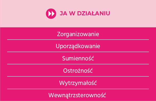 Działów HR do diagnozy kompetencji typu: zarządzanie sobą w czasie, zarządzanie własną pracą, zorganizowanie, planowanie, sumienność wykonywania działań, wytrzymałość w działaniu czy dążenie do celu pracowników. Służy identyfikacji mocnych stron oraz obszarów rozwoju w celu zmiany zakresu obowiązków, stanowiska, awansu czy określenia potrzeb szkoleniowych.