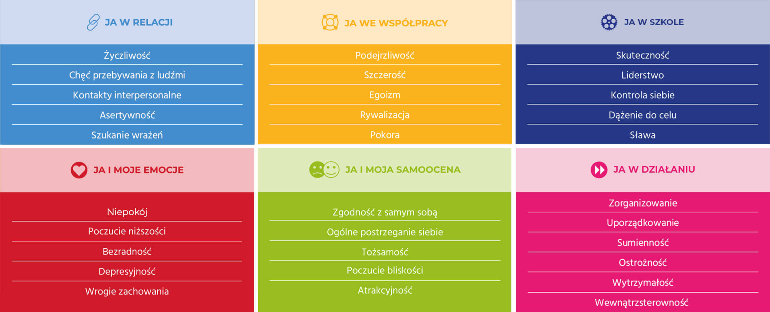 Test oparty jest na 6 wymiarach i 31 podwymiarach: